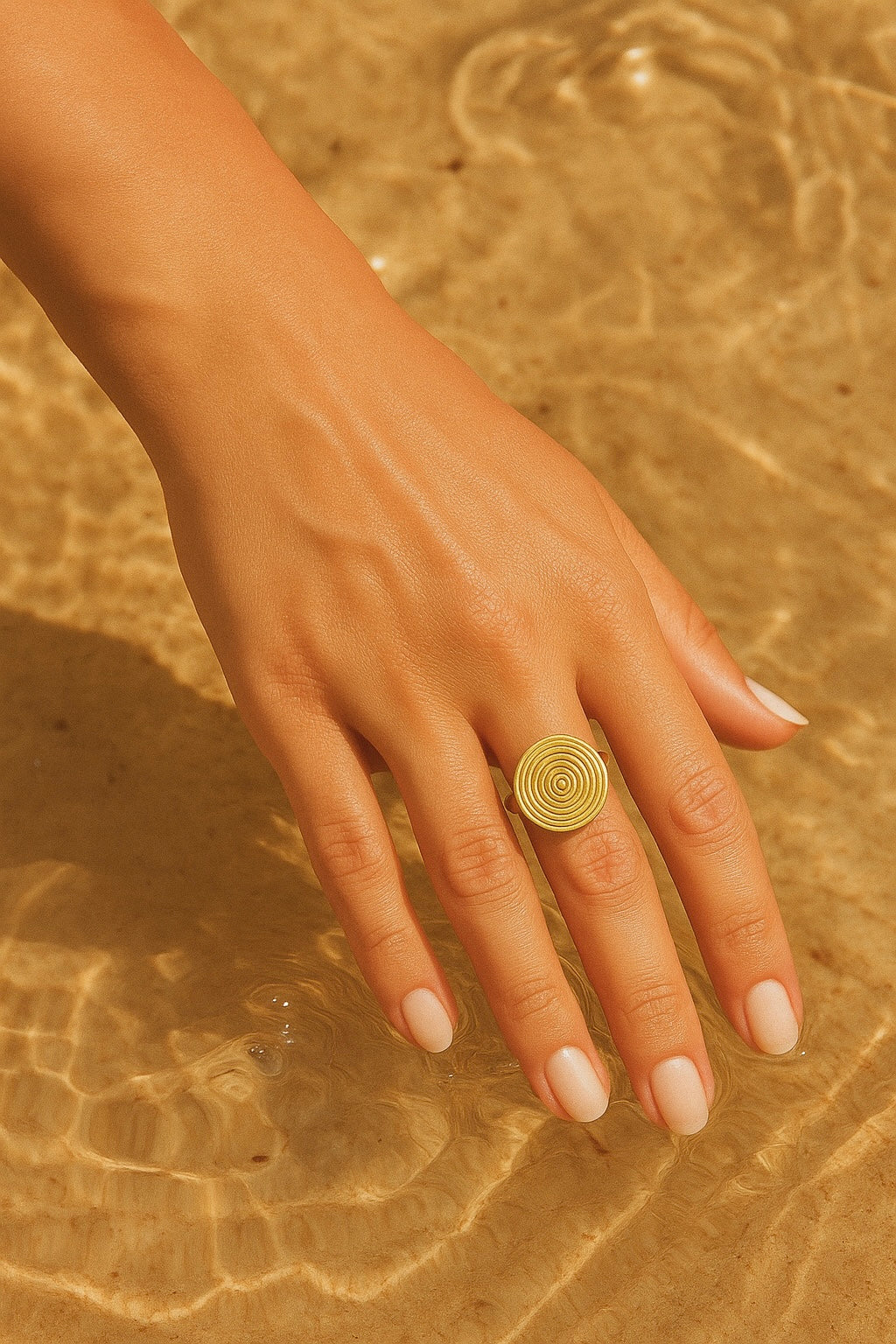 Inspired by ancient tribal symbolism, the Akaar Ring is a poetic nod to beginnings — to the first swirl of thought, the first shape of creation. Handcrafted in pure brass with a matte gold finish, its spiral design echoes movement, growth, and the continuity of self.