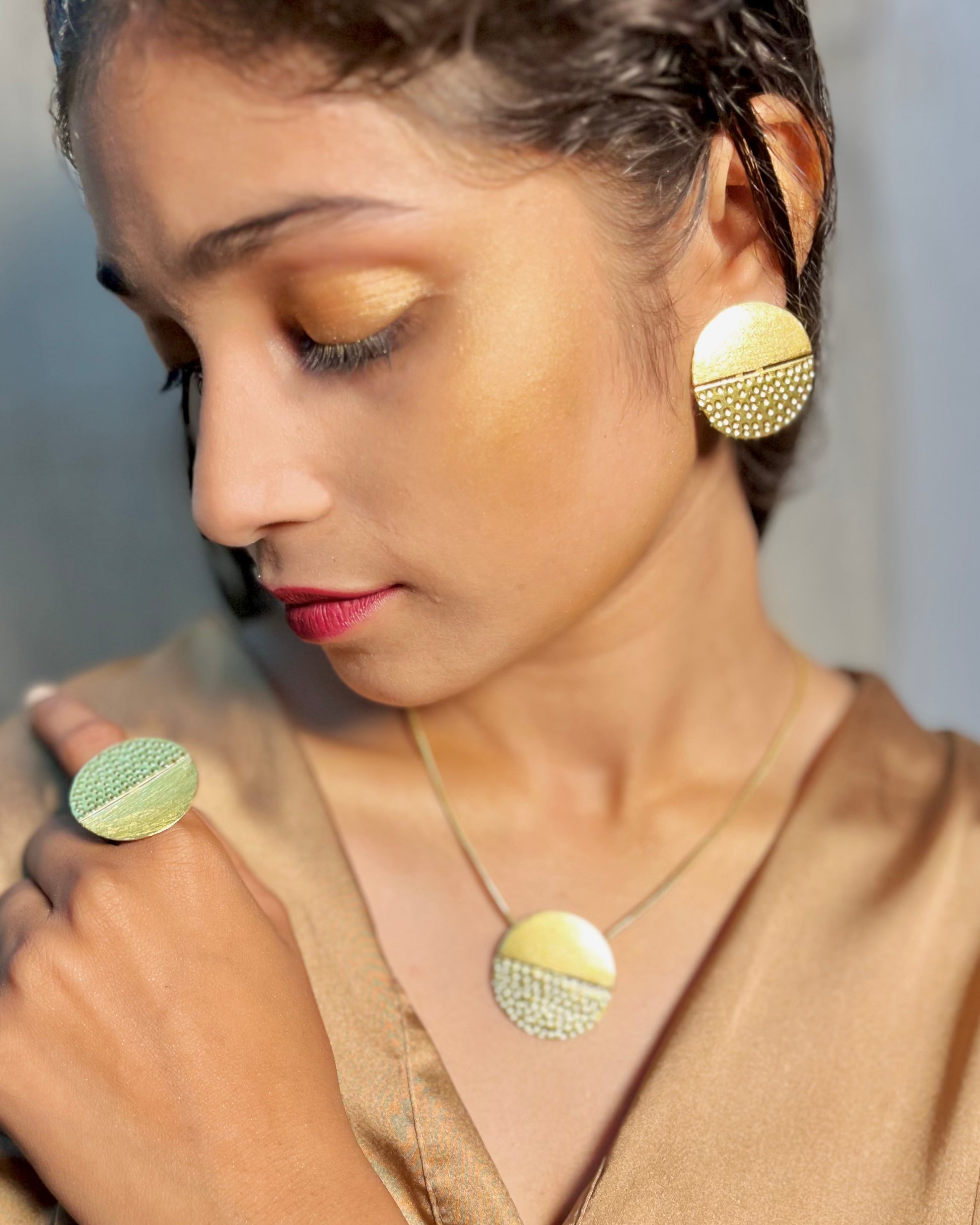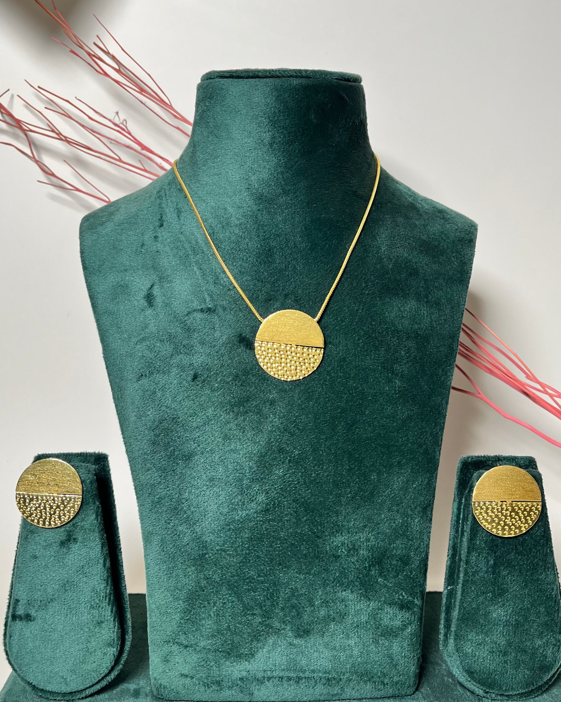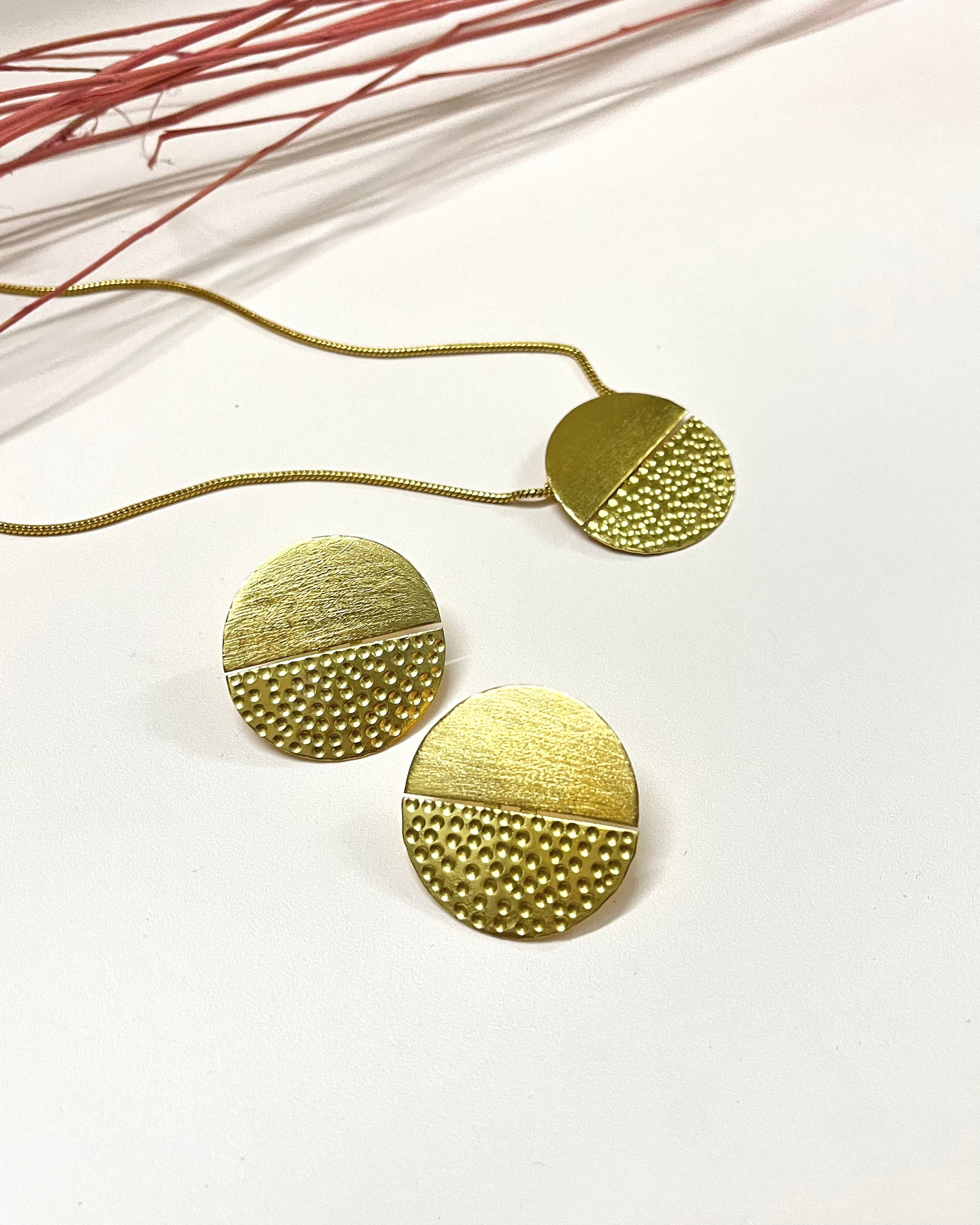 Our Ecliptic Set from the "Golden Symmetry" collection, tailored for those with a discerning taste in distinctive accessories. Inspired by the captivating allure of geometric forms found in our surroundings, this design uniquely captures the essence of the earth. The round shape signifies our planet, while the other half elegantly hammered, mirrors the brilliance of stars, creating a set that beautifully harmonises with the celestial dance of shapes and textures.