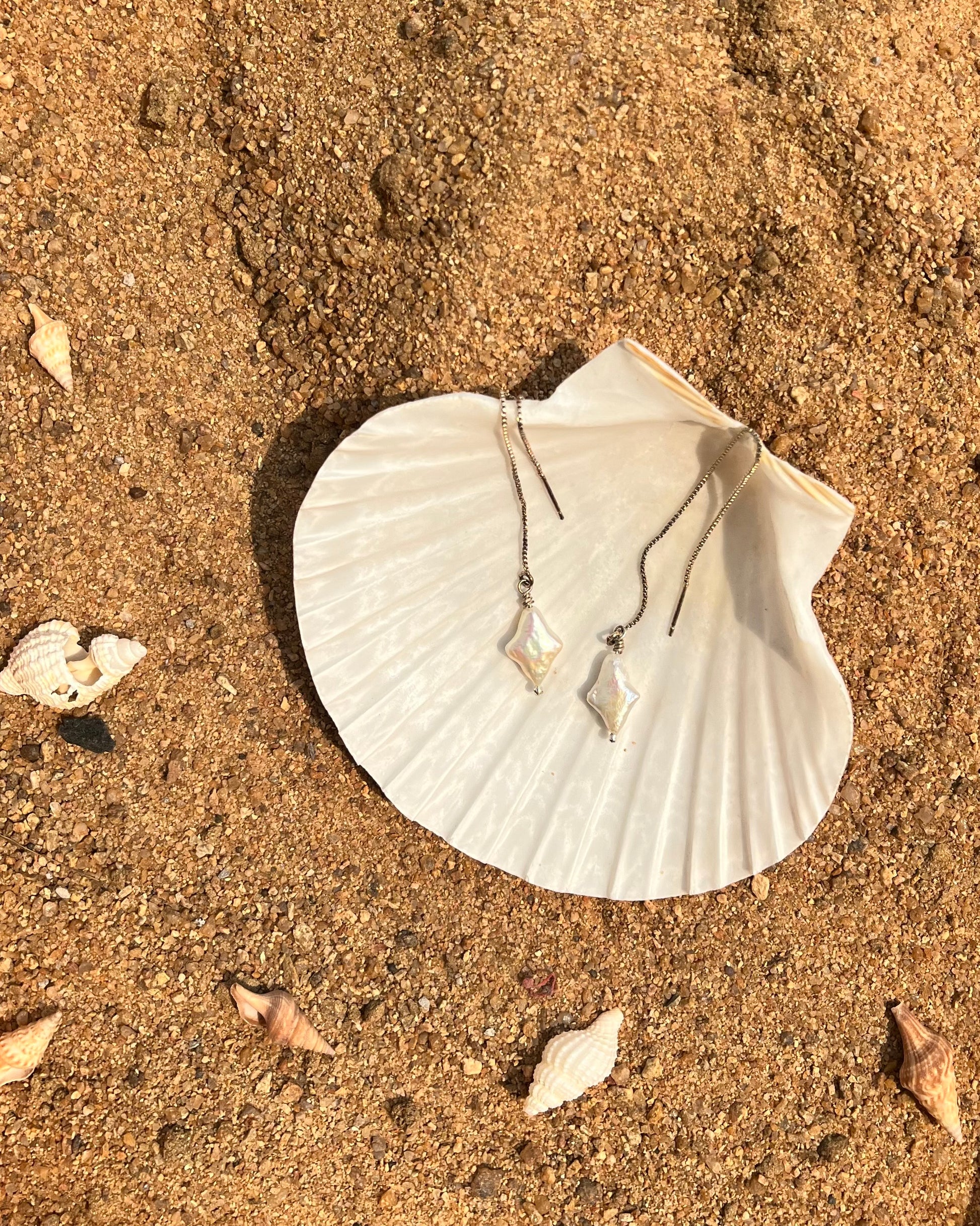 Diamond Pearl Thread Earring, where each pearl takes on the enchanting shape of diamonds. This striking fusion of sophistication and uniqueness adds a touch of glamour to your ensemble, ensuring a wow factor that resonates with timeless beauty.
