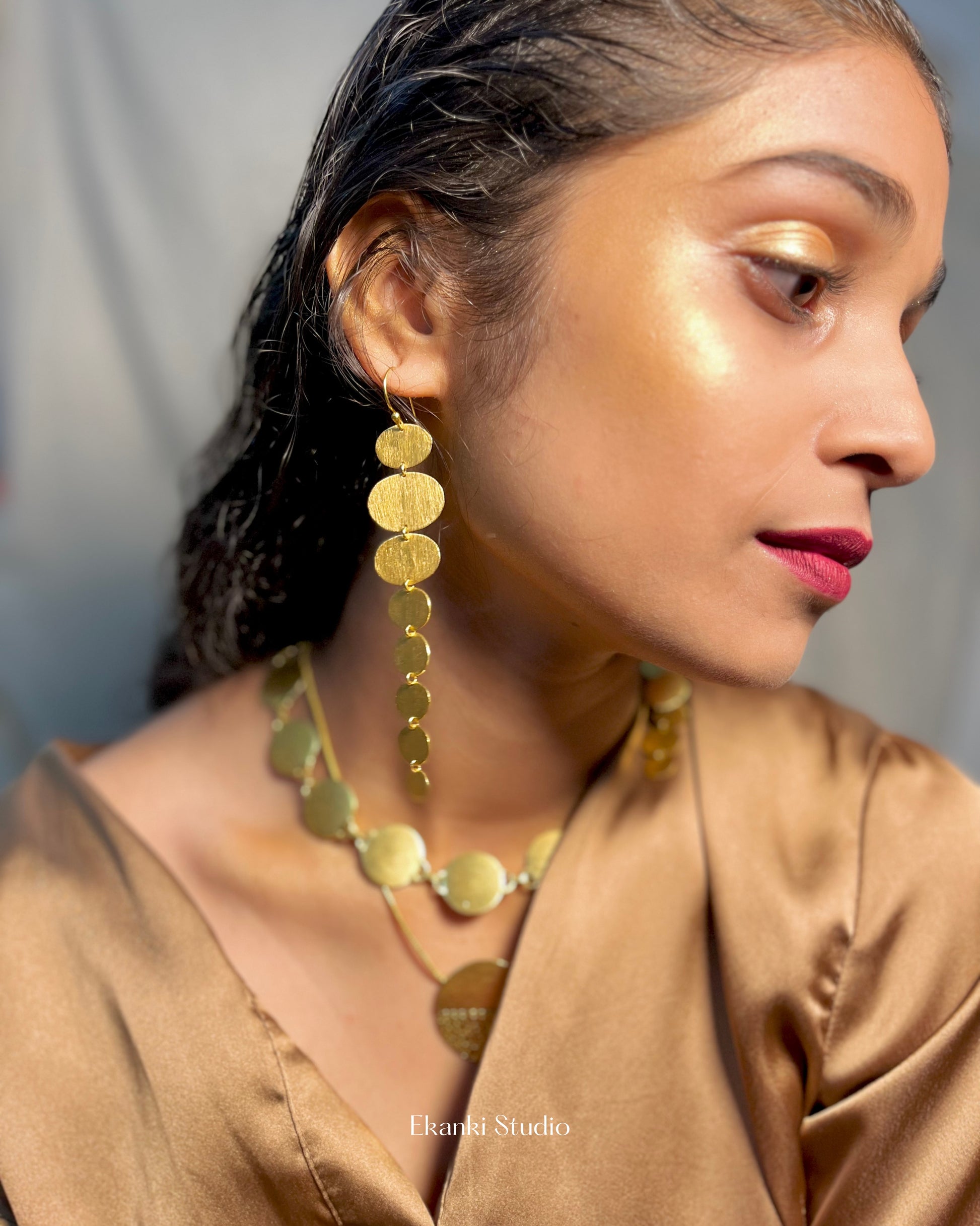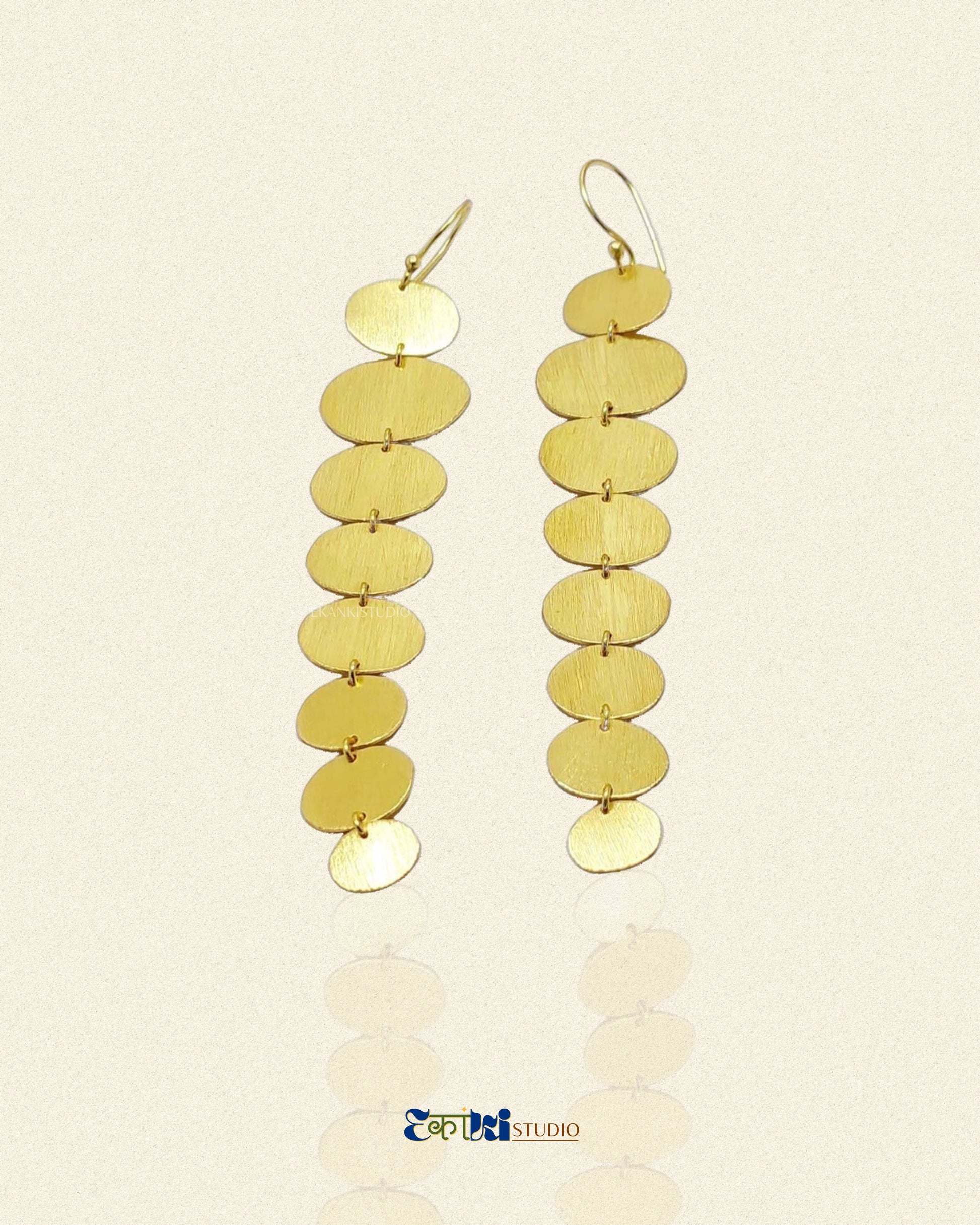 Disc Divine Dangler Earring from the "Golden Symmetry" collection. Crafted with 18K brass gold plating, these earrings boast eight varying oval sizes, each exuding its own charm. Elevate your look with their divine elegance and timeless allure.