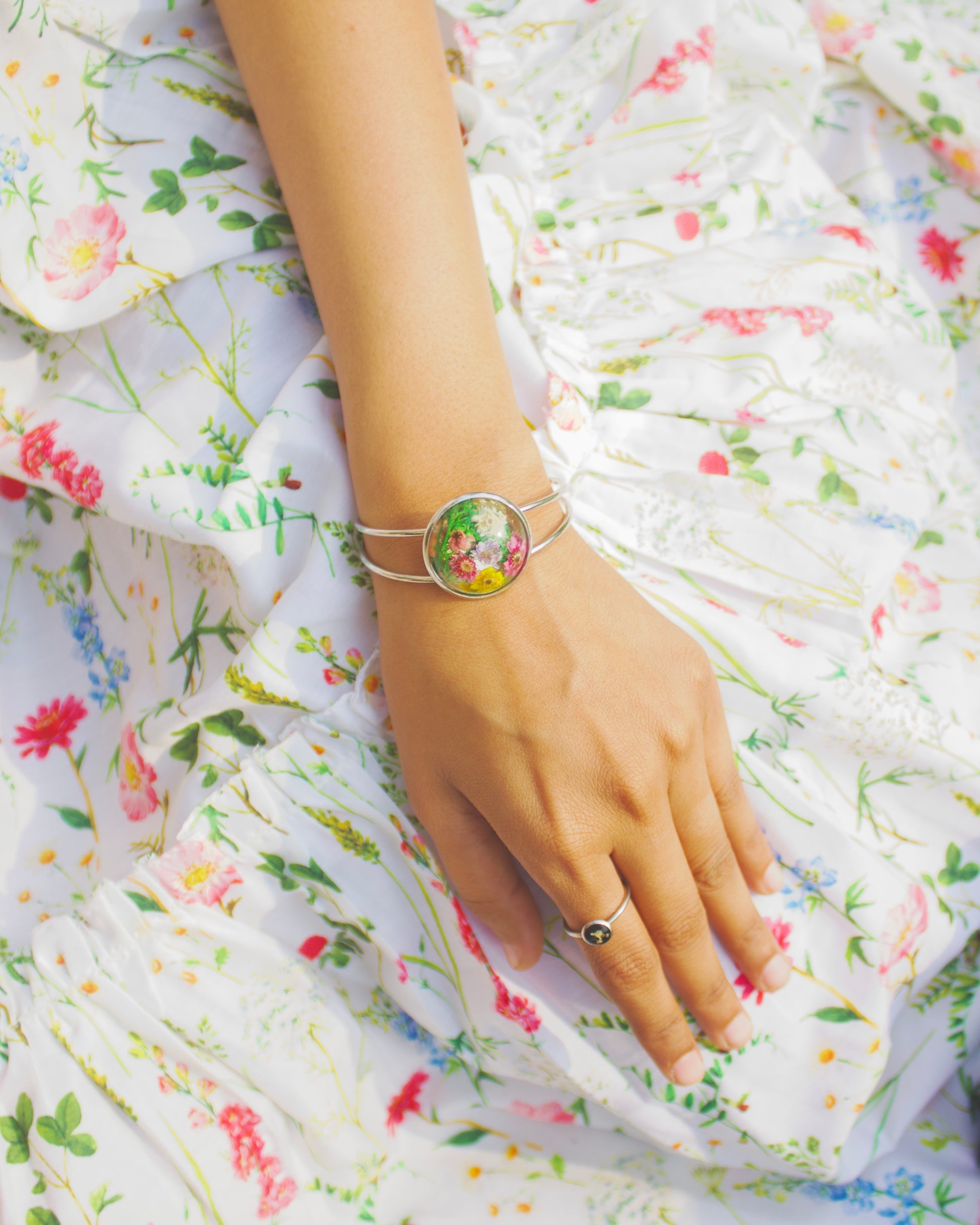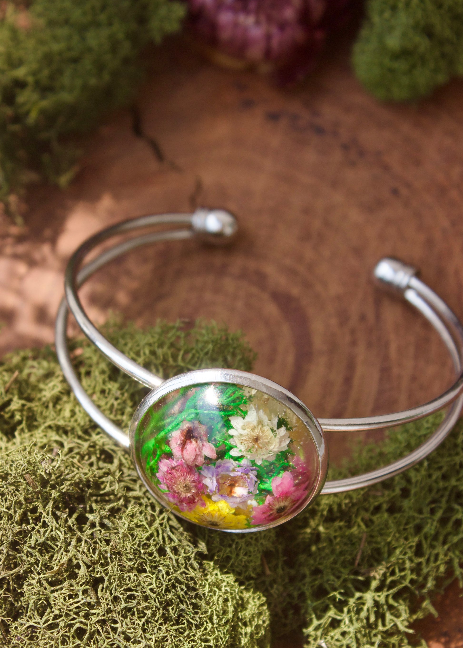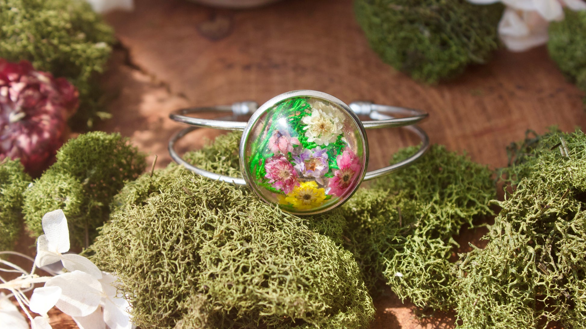 Hold a world of micro flowers in your hands with our creation, the Lost Forest. In the midst of this restless, unstoppable life, embrace nature's beauty on your wrist. Stylishly showcasing each piece, every item is uniquely crafted, making it a world of its own.